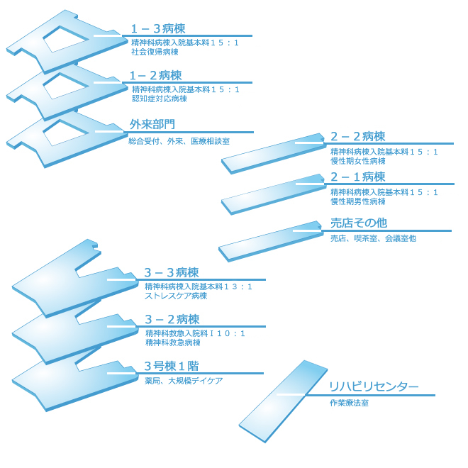 休息を目的とした、ストレスケア病棟です。全室個室です。心と身体の回復をお手伝いいたします。各種心理教育プログラム、手工芸、リフレッシュ体操等を行っております。